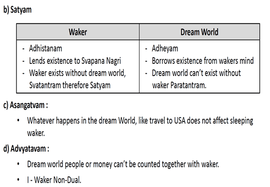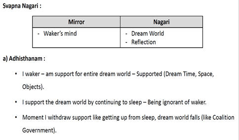 Essentially the first Sloka of the Dakṣiṇāmūrti Sthothram deals with “atma svaroopam” which Adi Sankaracharya reveals with two day to day examples of “darpana nagari” and “svapna nagari”. The Atma is revealed as the base “adishtaanam” of the Universe, as the independent existence – truth “sathya”, as the one unaffected by the events and whatever happens “asamgaha” and finally as non dual “advayam”, the Brahman Himself.