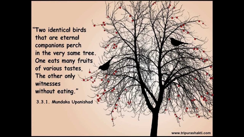 Two birds bound to each other in close friendship are perched on a tree. While one of the birds is busy consuming the fruits of the tree with great relish, the other seems to be in a state of detached equanimity just looking at its compatriot. The tree in this example represents the body. The bird busying itself with the material pleasures accorded by the tree is the ‘Jivātma’ (individual soul), that has an inextricable identification with the body and mind. Such an identification makes the Jivātma both the ‘karta’ (doer) and the ‘Bhokta’ (enjoyer). The observing bird on the other hand, represents the ‘Paramātma’ (the Supreme Self). The Supreme Self remains uninfluenced and untainted by any material pleasures and possessions and remains a still tranquil witness.