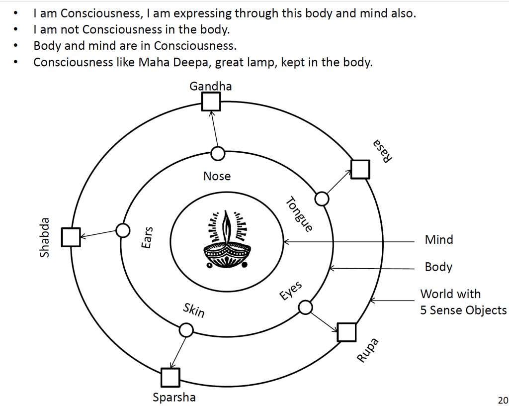 Every wave of thought in the mind (vritti pariṇāma) is illumined by an awareness – the maha deepa. This maha deepa goes out through thro 5 indriyas and get back to the reflecting medium – mind for “I know” (jaanaami ithi) – The learning from the Second Experiment.
