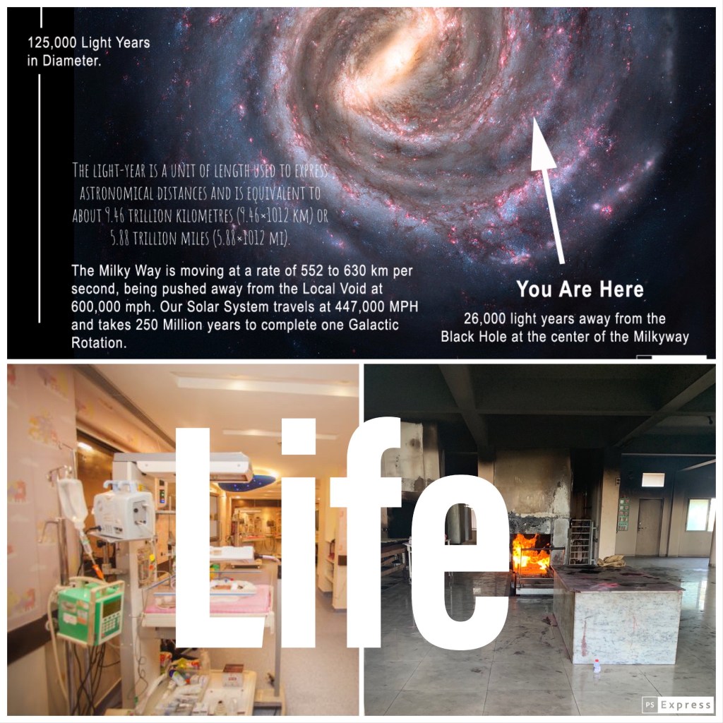 For all of us, Life is nothing but the time spent between the maternity ward and crematorium on the “surface of a tiny rock-ball 26000 light years away from the black hole, rotating around a spherical fire in a tiny galaxy in an ever expanding galaxies” as depicted in the above picture.