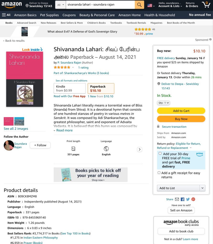 Adi Sankaracharya’s Sivananda Lahari and Dakshinamurthy Stothram – All the Sanskrit Verses with Transliteration, translation and meaning in English and Tamil is available at Amzon Kindle and will be available at